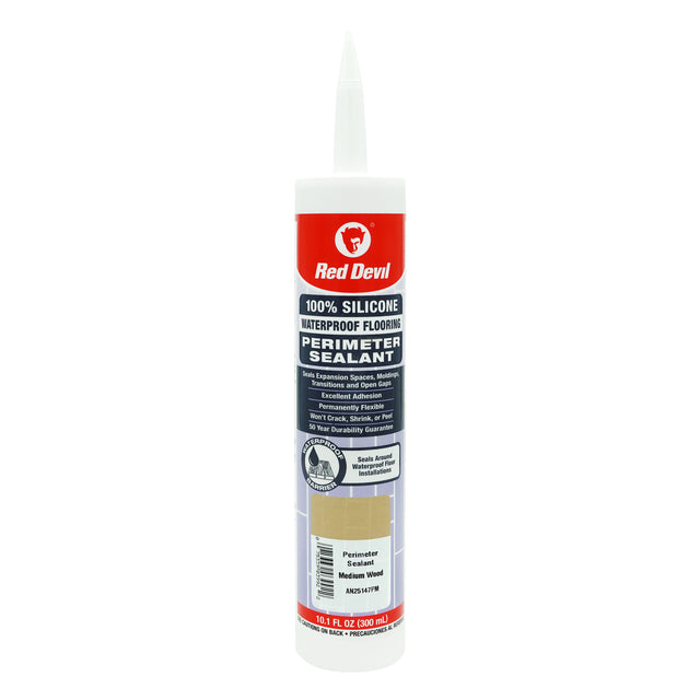 The Red Devil 100% Silicone Perimeter Sealant is specially formulated to seal around waterproof flooring installations, including Laminate, LVP, LVT, Engineered Hardwood, and Tile floors. This medium-modulus sealant accommodates for floor swelling or contracting and is designed to blend with all general flooring colors.