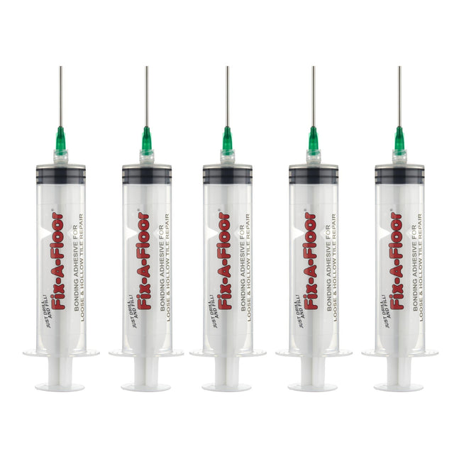 Pack of 5 Fix-A-Floor 60ml Syringe Kit with flat stainless steel needles, Plastic applicator & Sealing Caps (Adhesive Not Included) is backordered and will ship as soon as it is back in stock.